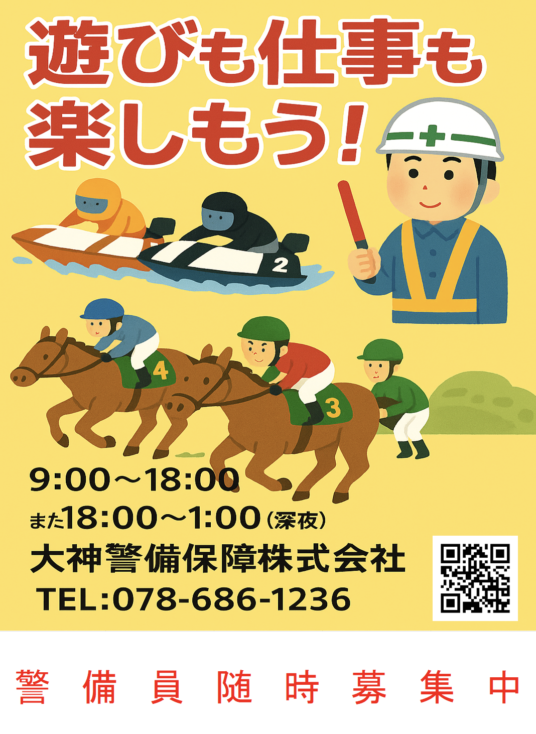 当社は電力会社の電気工事現場での交通誘導警備会社です。現場は長期の契約が多く、安定しているので、安心して働けるかと 思います。 工事現場での交通をスムーズに進めるのが仕事です。責任もありますが、頑張っていれば、やりがいもある仕事です。楽しくやりましょう! Equipment overview 事業内容 交通誘導警備はきつい仕事だと思われるかもしれませんが、「立ちっぱなしでしんどい・・・」の悩みは一切なし! Recruitment 警備員随時募集中 日給:9000円~11500円 運転手当:1000円 月曜日から金曜日勤務可能! 関電さんの仕事です! 安定して仕事あります! 週1でも可能! 募集サイトはこちら 【大神警備保障株式会社】の採用サイト Company 会社概要 会社名 大神警備保障株式会社 代表者 丸山 宏之 所在地 神戸市兵庫区出在家町2丁目4-3 ハイツ1階 TEL 078-686-1236 警備業標識 その他資格 警備員指導教育責任者1号・2号